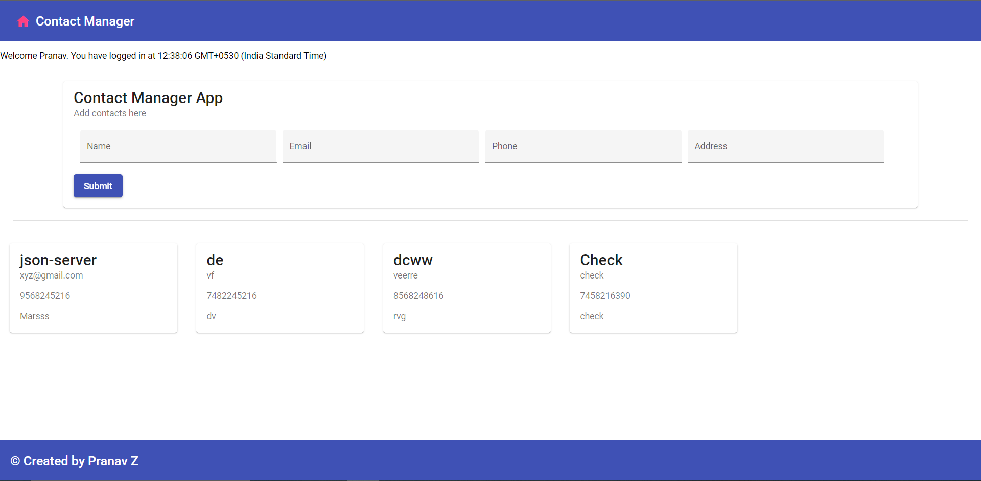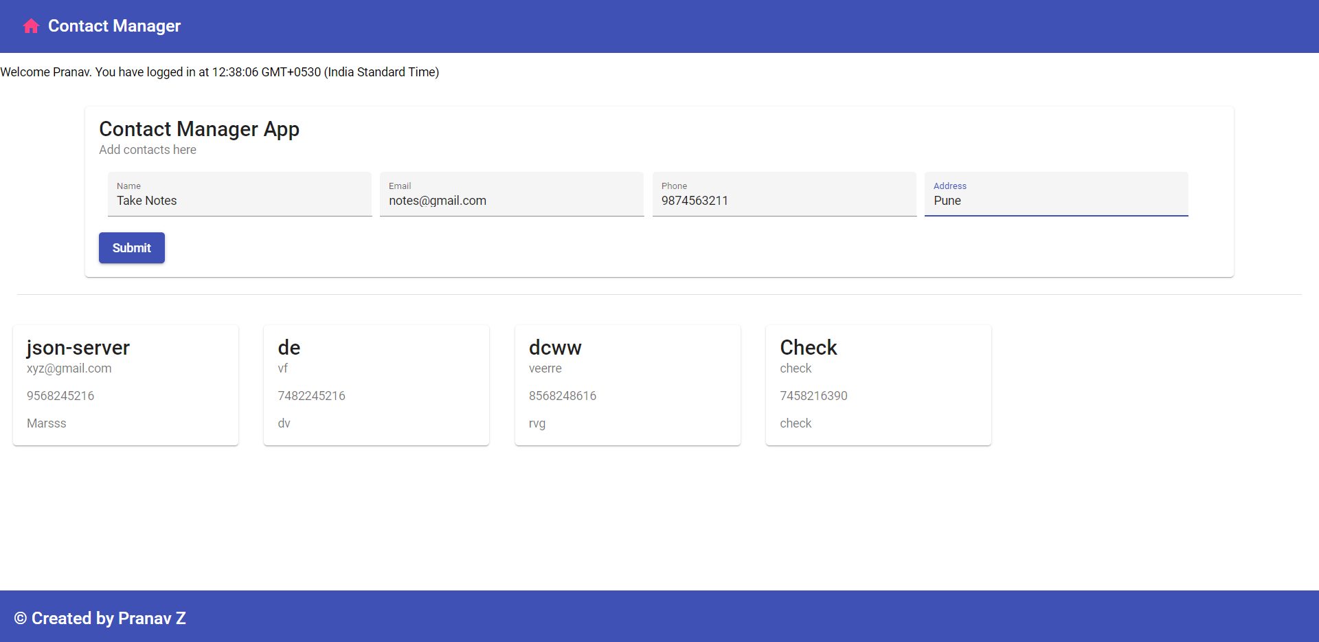 A online Contact Manager where user can add contact details and store it in form on json-data.